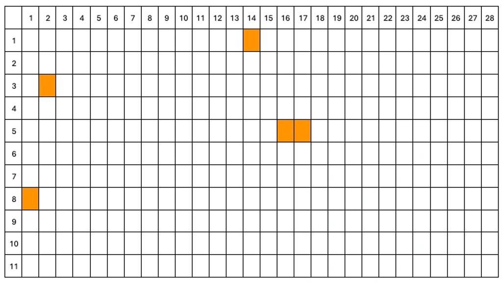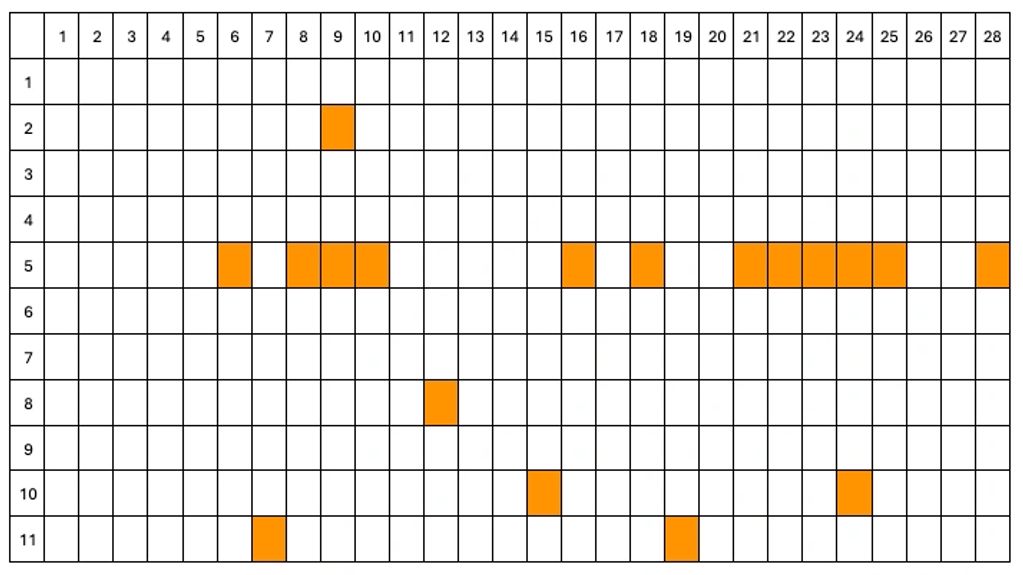 3 - Matrix of emotions - shows when participants strongly agreed with feeling a specific emotions per phase. X axis - phases. Y axis - participants.